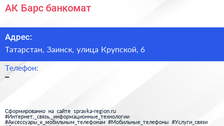АК Барс, банкомат по адресу Татарстан, Заинск, улица Крупской, 6 в дальнейшем Организация, размещена в следующих категориях: