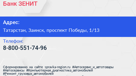 Банк ЗЕНИТ по адресу Татарстан, Заинск, проспект Победы, 1/13 в дальнейшем Организация, размещена в следующих категориях: