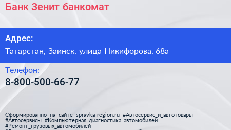 Банк Зенит, банкомат по адресу Татарстан, Заинск, улица Никифорова, 68а в дальнейшем Организация, размещена в следующих категориях: