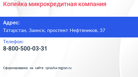 Копейка, микрокредитная компания по адресу Татарстан, Заинск, проспект Нефтяников, 37 в дальнейшем Организация, размещена в следующих категориях: