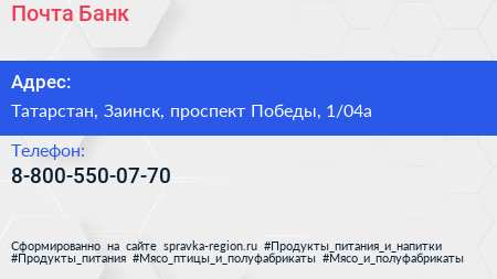 Почта Банк по адресу Татарстан, Заинск, проспект Победы, 1/04а в дальнейшем Организация, размещена в следующих категориях: