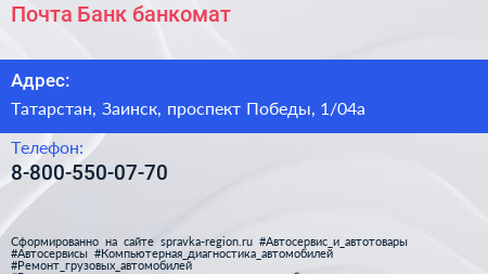 Почта Банк, банкомат по адресу Татарстан, Заинск, проспект Победы, 1/04а в дальнейшем Организация, размещена в следующих категориях: