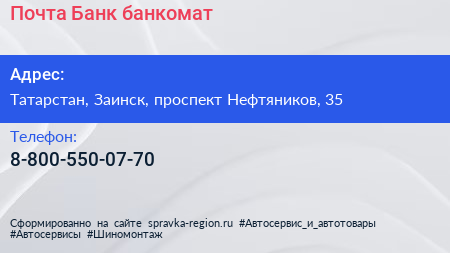 Почта Банк, банкомат по адресу Татарстан, Заинск, проспект Нефтяников, 35 в дальнейшем Организация, размещена в следующих категориях: