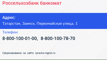 Россельхозбанк, банкомат по адресу Татарстан, Заинск, Первомайская улица, 1 в дальнейшем Организация, размещена в следующих категориях: