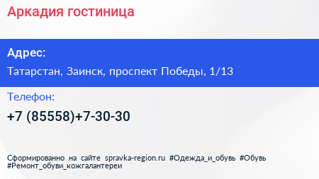 Аркадия, гостиница по адресу Татарстан, Заинск, проспект Победы, 1/13 в дальнейшем Организация, размещена в следующих категориях: