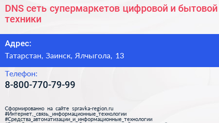 DNS, сеть супермаркетов цифровой и бытовой техники по адресу Татарстан, Заинск, Ялчыгола, 13 в дальнейшем Организация, размещена в следующих категориях: