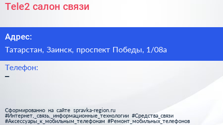 Tele2, салон связи по адресу Татарстан, Заинск, проспект Победы, 1/08а в дальнейшем Организация, размещена в следующих категориях: