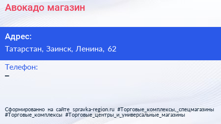 Авокадо, магазин по адресу Татарстан, Заинск, Ленина, 62 в дальнейшем Организация, размещена в следующих категориях:
