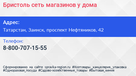 Бристоль, сеть магазинов у дома по адресу Татарстан, Заинск, проспект Нефтяников, 42 в дальнейшем Организация, размещена в следующих категориях: