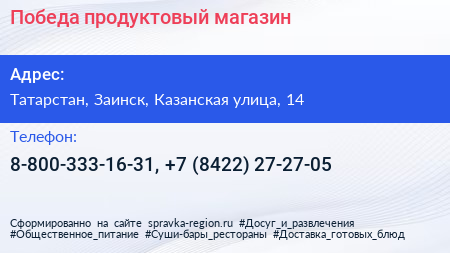 Победа, продуктовый магазин по адресу Татарстан, Заинск, Казанская улица, 14 в дальнейшем Организация, размещена в следующих категориях: