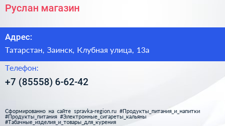 Руслан, магазин по адресу Татарстан, Заинск, Клубная улица, 13а в дальнейшем Организация, размещена в следующих категориях: