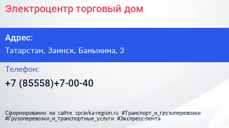 Электроцентр, торговый дом по адресу Татарстан, Заинск, Баныкина, 3 в дальнейшем Организация, размещена в следующих категориях: