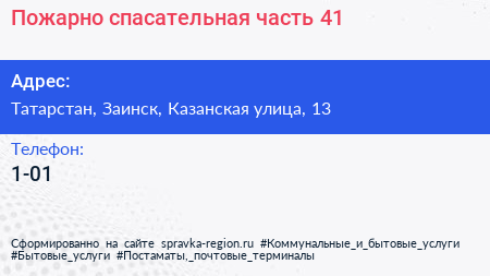 Пожарно-спасательная часть №41 по адресу Татарстан, Заинск, Казанская улица, 13 в дальнейшем Организация, размещена в следующих категориях: