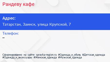 Рандеву, кафе по адресу Татарстан, Заинск, улица Крупской, 7 в дальнейшем Организация, размещена в следующих категориях: