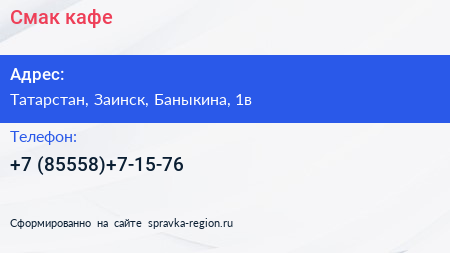 Смак, кафе по адресу Татарстан, Заинск, Баныкина, 1в в дальнейшем Организация, размещена в следующих категориях: