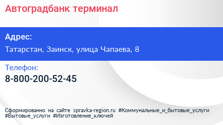 Автоградбанк, терминал по адресу Татарстан, Заинск, улица Чапаева, 8 в дальнейшем Организация, размещена в следующих категориях: