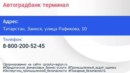 Автоградбанк, терминал по адресу Татарстан, Заинск, улица Рафикова, 10 в дальнейшем Организация, размещена в следующих категориях: