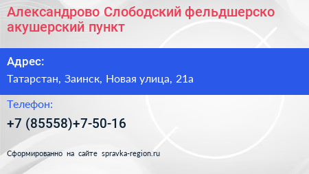 Александрово-Слободский фельдшерско-акушерский пункт по адресу Татарстан, Заинск, Новая улица, 21а в дальнейшем Организация, размещена в следующих категориях: