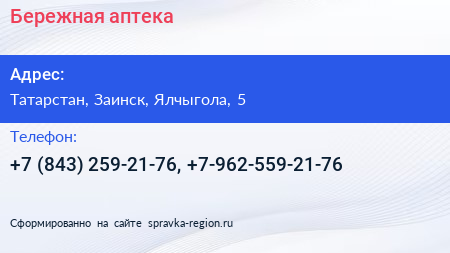 Бережная аптека по адресу Татарстан, Заинск, Ялчыгола, 5 в дальнейшем Организация, размещена в следующих категориях: