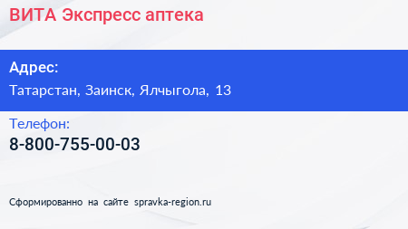 ВИТА Экспресс, аптека по адресу Татарстан, Заинск, Ялчыгола, 13 в дальнейшем Организация, размещена в следующих категориях:
