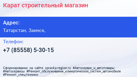 Карат, строительный магазин по адресу Татарстан, Заинск, в дальнейшем Организация, размещена в следующих категориях: