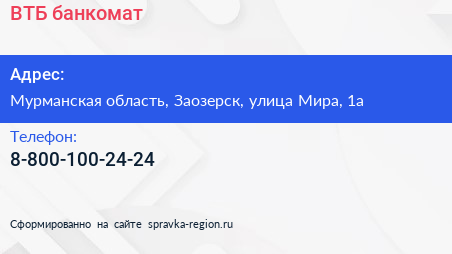 ВТБ, банкомат по адресу Мурманская область, Заозерск, улица Мира, 1а в дальнейшем Организация, размещена в следующих категориях: