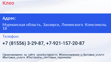 Клео по адресу Мурманская область, Заозерск, Ленинского Комсомола, 18 в дальнейшем Организация, размещена в следующих категориях: