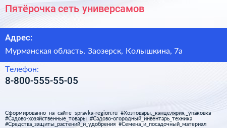 Пятёрочка, сеть универсамов по адресу Мурманская область, Заозерск, Колышкина, 7а в дальнейшем Организация, размещена в следующих категориях: