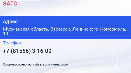 ЗАГС по адресу Мурманская область, Заозерск, Ленинского Комсомола, 14 в дальнейшем Организация, размещена в следующих категориях: