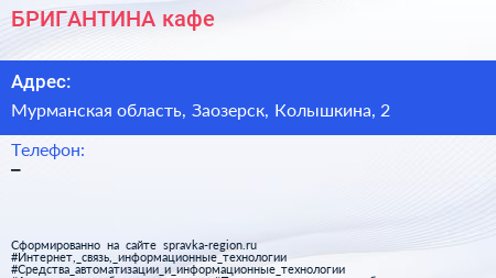 БРИГАНТИНА, кафе по адресу Мурманская область, Заозерск, Колышкина, 2 в дальнейшем Организация, размещена в следующих категориях: