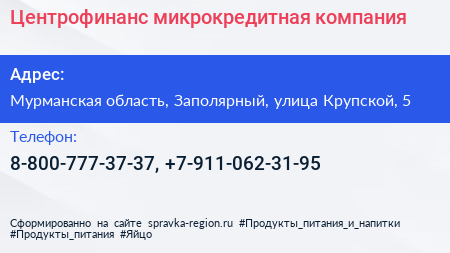 Центрофинанс, микрокредитная компания по адресу Мурманская область, Заполярный, улица Крупской, 5 в дальнейшем Организация, размещена в следующих категориях: