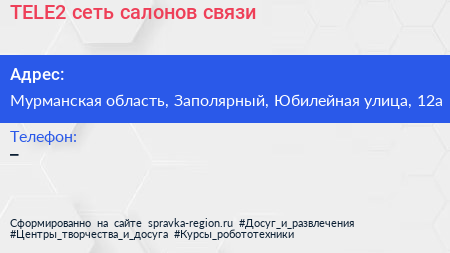 TELE2, сеть салонов связи по адресу Мурманская область, Заполярный, Юбилейная улица, 12а в дальнейшем Организация, размещена в следующих категориях: