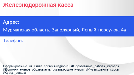 Железнодорожная касса по адресу Мурманская область, Заполярный, Ясный переулок, 4а в дальнейшем Организация, размещена в следующих категориях: