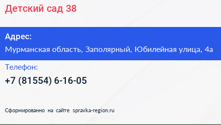 Детский сад №38 по адресу Мурманская область, Заполярный, Юбилейная улица, 4а в дальнейшем Организация, размещена в следующих категориях: