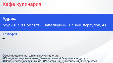 Кафе-кулинария по адресу Мурманская область, Заполярный, Ясный переулок, 4а в дальнейшем Организация, размещена в следующих категориях: