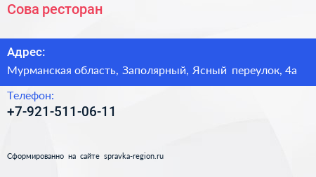 Сова, ресторан по адресу Мурманская область, Заполярный, Ясный переулок, 4а в дальнейшем Организация, размещена в следующих категориях: