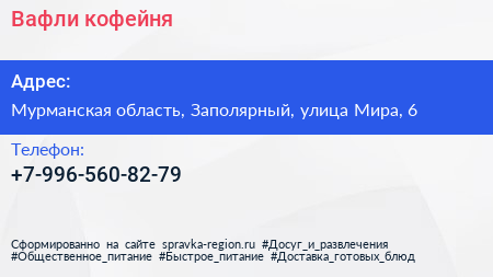 Вафли, кофейня по адресу Мурманская область, Заполярный, улица Мира, 6 в дальнейшем Организация, размещена в следующих категориях: