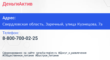 ДеньгиАктив по адресу Свердловская область, Заречный, улица Кузнецова, 7а в дальнейшем Организация, размещена в следующих категориях: