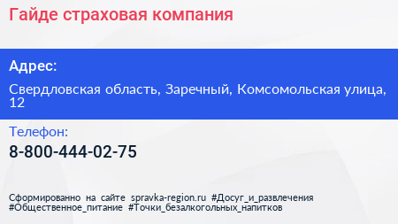 Гайде, страховая компания по адресу Свердловская область, Заречный, Комсомольская улица, 12 в дальнейшем Организация, размещена в следующих категориях: