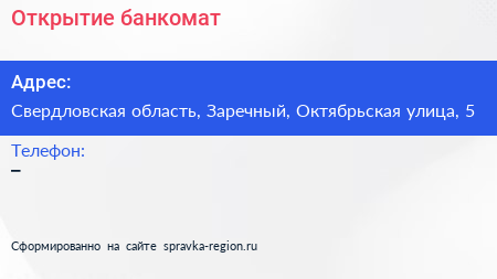 Открытие, банкомат по адресу Свердловская область, Заречный, Октябрьская улица, 5 в дальнейшем Организация, размещена в следующих категориях: