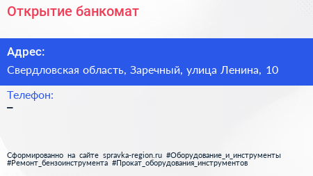 Открытие, банкомат по адресу Свердловская область, Заречный, улица Ленина, 10 в дальнейшем Организация, размещена в следующих категориях: