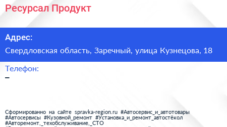 Ресурсал Продукт по адресу Свердловская область, Заречный, улица Кузнецова, 18 в дальнейшем Организация, размещена в следующих категориях: