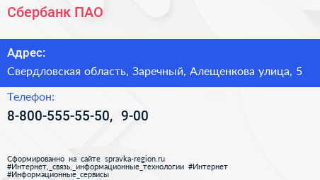 Сбербанк, ПАО по адресу Свердловская область, Заречный, Алещенкова улица, 5 в дальнейшем Организация, размещена в следующих категориях: