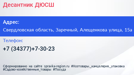 Десантник, ДЮСШ по адресу Свердловская область, Заречный, Алещенкова улица, 15а в дальнейшем Организация, размещена в следующих категориях: