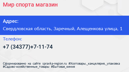 Мир спорта, магазин по адресу Свердловская область, Заречный, Алещенкова улица, 1 в дальнейшем Организация, размещена в следующих категориях: