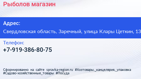 Рыболов, магазин по адресу Свердловская область, Заречный, улица Клары Цеткин, 13 в дальнейшем Организация, размещена в следующих категориях: