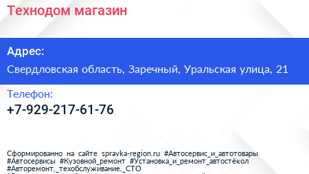 Технодом, магазин по адресу Свердловская область, Заречный, Уральская улица, 21 в дальнейшем Организация, размещена в следующих категориях: