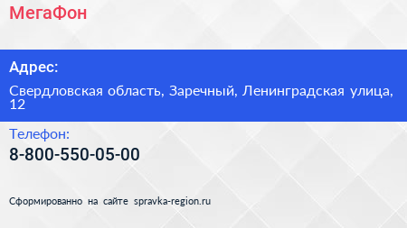 МегаФон по адресу Свердловская область, Заречный, Ленинградская улица, 12 в дальнейшем Организация, размещена в следующих категориях: