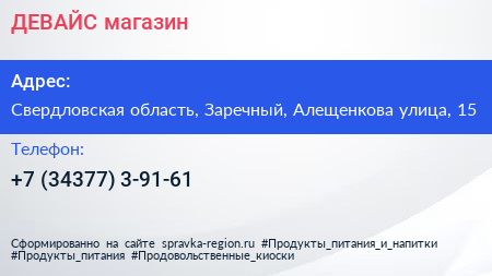 ДЕВАЙС, магазин по адресу Свердловская область, Заречный, Алещенкова улица, 15 в дальнейшем Организация, размещена в следующих категориях: