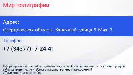 Мир полиграфии по адресу Свердловская область, Заречный, улица 9 Мая, 3 в дальнейшем Организация, размещена в следующих категориях: